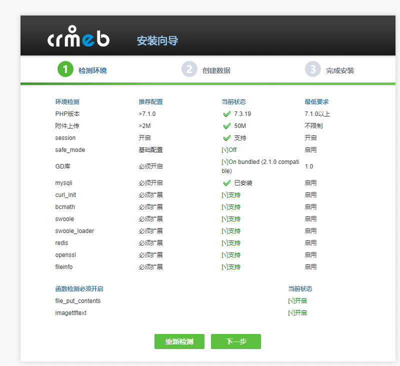2.:检查环境是否都正确,确认无误后,点击下一步。如有X号等错误提示,请根据提示修改服务器环境配置。