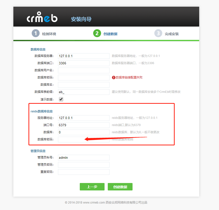 5.填写管理员密码后,点击创建数据。程序开始自动安装